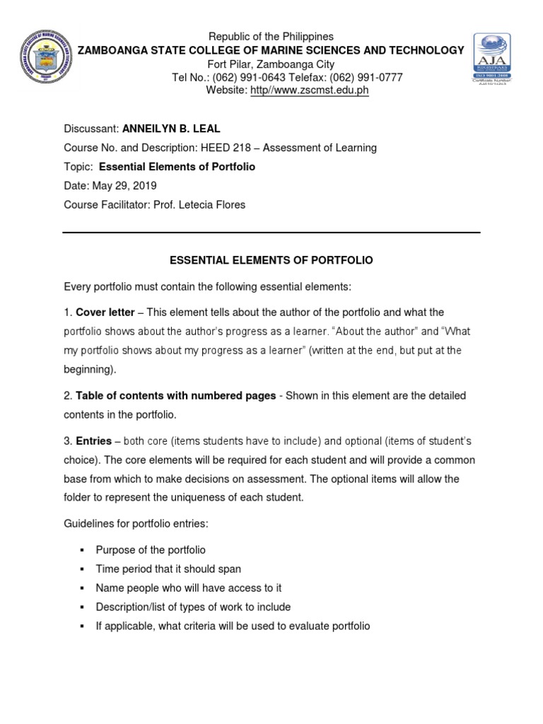 Assessment Essential Elements Of Portfolio Docx Learning