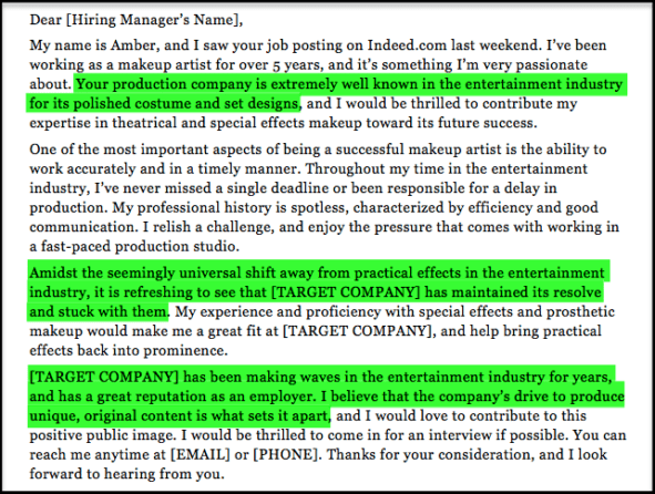 Find out how to create a professional cover letter in our guide. For help with your resume check out our extensive make up artist resume samples. I am writing to apply for the makeup artist position with winston film company.